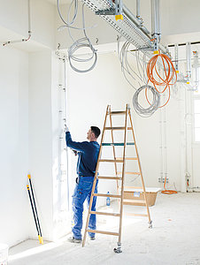 Mehr als drei Jahre arbeitete sich das Team der Berliner EAG-Niederlassung Altmann & Böhning durch das historische Ullsteinhaus in Berlin-Tempelhof. Nach dem sogenannten Neubau aus den 1950er-Jahren wurde der Altbau bis zum Uhrenturm Zug um Zug elektrotechnisch modernisiert. Dabei war nicht von Anfang an klar, dass man die Gesamtsanierung des gigantischen Gebäudes durchführen würde. Um für spätere Umnutzungen gerüstet zu sein, setzte der Vermieter auf eine elektrotechnische Rundumerneuerung. Neben der kompletten Niederspannungsinstallation für die 60.000 m² umfassenden Büroflächen und Gewerbe führte das Team von Altmann & Böhning die Installation der Hauptstromversorgung ab den Zählereinrichtungen aus. Da das Gebäude mit innerem und äußerem Denkmalschutz bedacht ist, galt es entsprechende Anforderungen zu beachten. Nicht ganz einfach war es etwa, die neuen LED-Leuchtmittel in die historischen Lampen der sechs Treppenhäuser einzusetzen. Gegen Ende der Bauphase erwartete das Team von Altmann & Böhning noch eine Überraschung. Der Eigentümer entschloss sich, das Gelände zukunftssicher für E-Mobilität und mit 120 Ladestationen auszustatten. Um den dafür notwendigen Energiebedarf zu sichern, wurden zwei ausgediente Trafoanlagen reaktiviert sowie Leitungen zu einer neuen Station gelegt. Die Anlage steht nun bei Bedarf mit einer Gesamtleistung von 1.250 A parat.