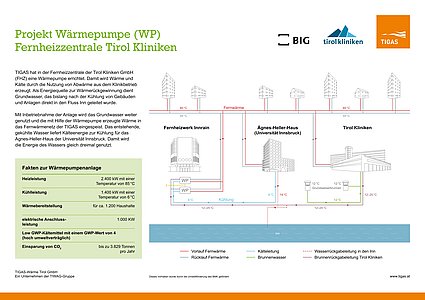 In Kooperation mit der TIGAS wurde in der Fernheizzentrale am Standort Innrain 96 eine Großwärmepumpe installiert. Die Abwärme aus dem Klinikbetrieb wird genutzt, um bis zu 1.200 Haushalte mit Fernwärme zu versorgen. Zusätzlich wird die anfallende Kälteenergie für die Kühlung eines Instituts der Universität Innsbruck verwendet. Durch diese innovative Lösung wird das Brunnenrückgabewasser mehrfach genutzt, wodurch die Gesamteffizienz gesteigert und jährlich rund 3.800 Tonnen CO₂-Emissionen eingespart werden. Mit einer Gesamtleistung von 2.4 MW im Heizbetrieb und 1.4 MW im Kühlbetrieb ist die Wärmepumpe in der Fernheizzentrale der Tirol Kliniken in Innsbruck eine der größten Österreichs und stellt ein europäisches Leuchtturmprojekt für die nachhaltige Energiebereitstellung dar.
